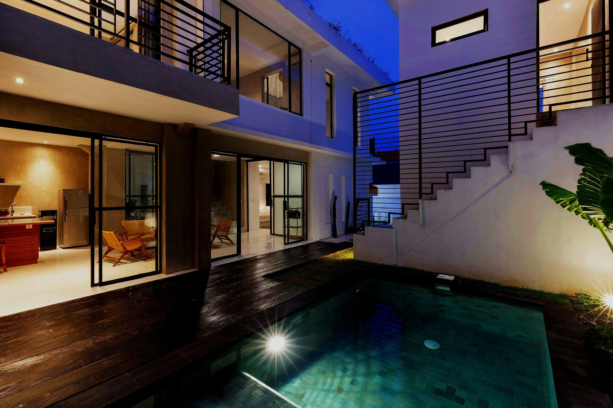 Modern residential house with outdoor pool, wooden deck, glass sliding doors, and staircase leading to upper level, illuminated at dusk.